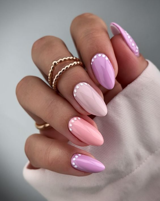 Soft lilac, blush, and pink almond-shaped nails create a delicate spring gradient. Tiny white pearl dots along the edges give a dainty, elegant finish.