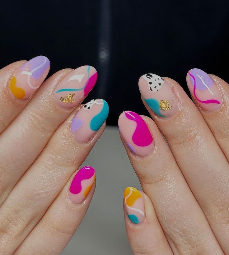 Lilac mixes with teal, pink, and yellow in abstract wavy patterns over a nude base. The look feels artsy, cheerful, and full of spring energy.
