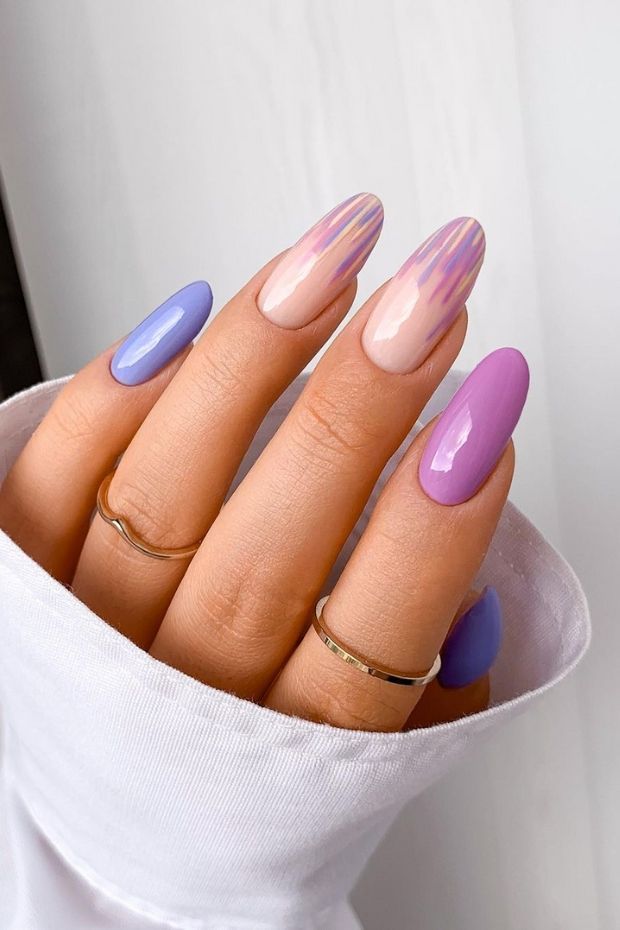 Long oval nails mix solid lilac with pastel rainbow swirl patterns for a smooth, flowing look. The design feels airy, modern, and candy-sweet.