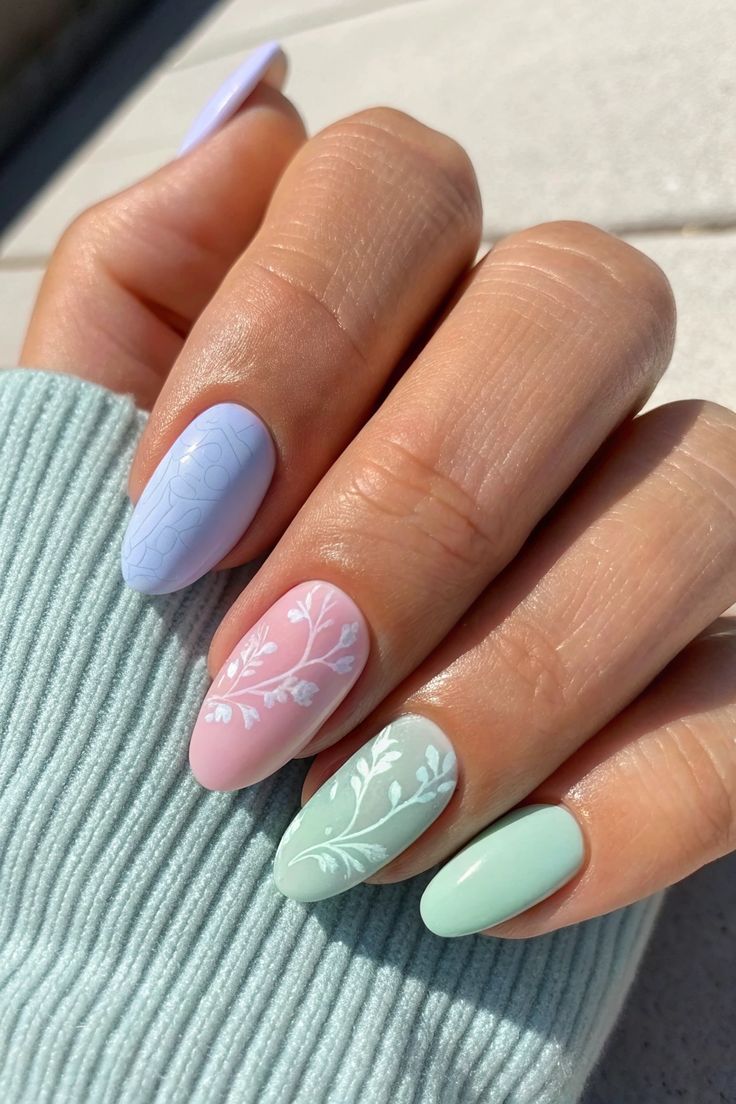 Mint, blush, and pale lilac nails are decorated with fine white leafy illustrations. This design feels fresh, botanical, and perfect for a gentle spring aesthetic.