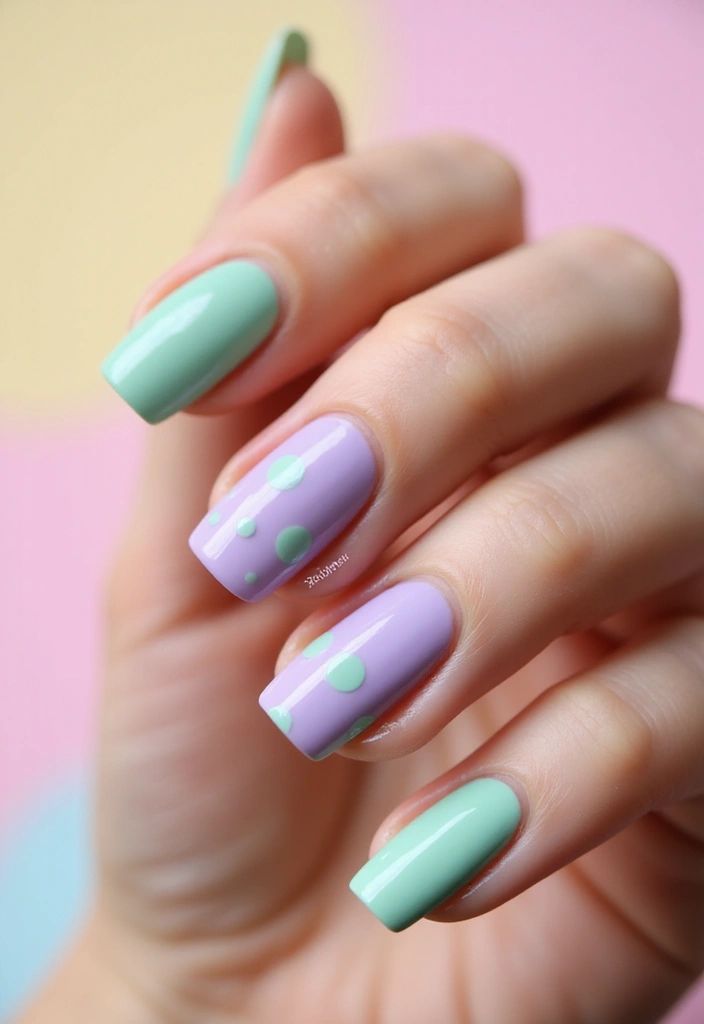 Square nails alternate between lilac and mint with playful pastel polka dots. The style is cute, retro-inspired, and lighthearted.