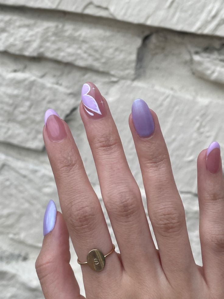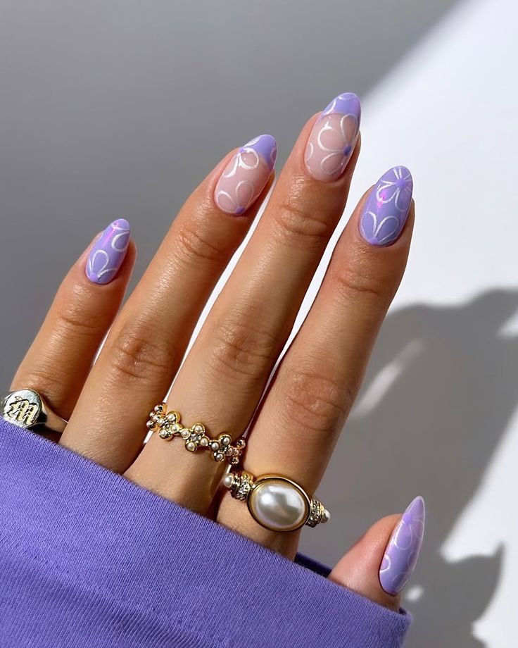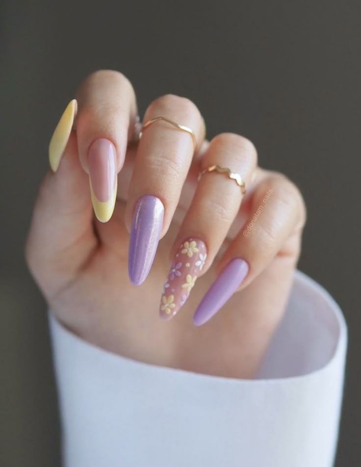 Long almond nails alternate between solid lilac, sheer pink, and subtle yellow-tipped accents with floral art. The design feels graceful, delicate, and slightly romantic.