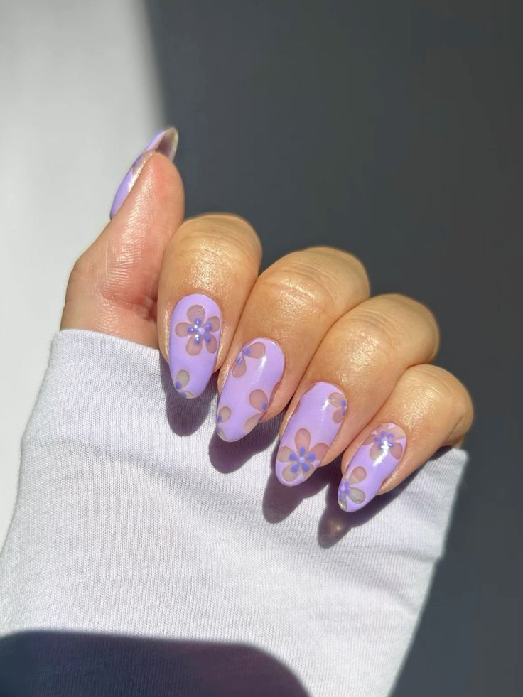 Light lilac nails feature translucent floral patterns with tiny daisy details. The overall vibe is cute, spring-inspired, and slightly whimsical.
