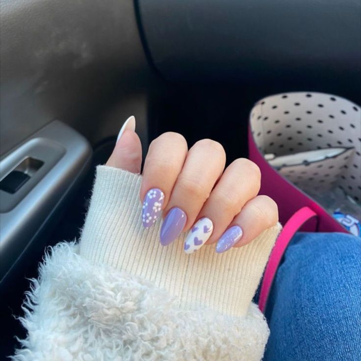 Soft lilac nails mix solid color with tiny white hearts and delicate dot patterns for a cute, playful spring vibe. The overall look feels sweet, cozy, and youthful.