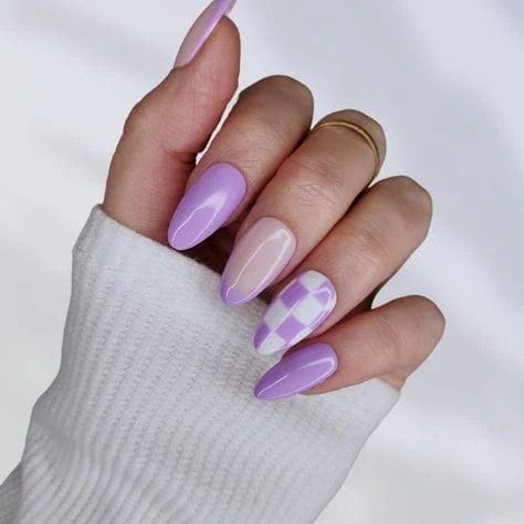 Glossy lilac nails feature a simple checkered accent for a clean and trendy style. The design feels modern, minimal, and fresh for spring.