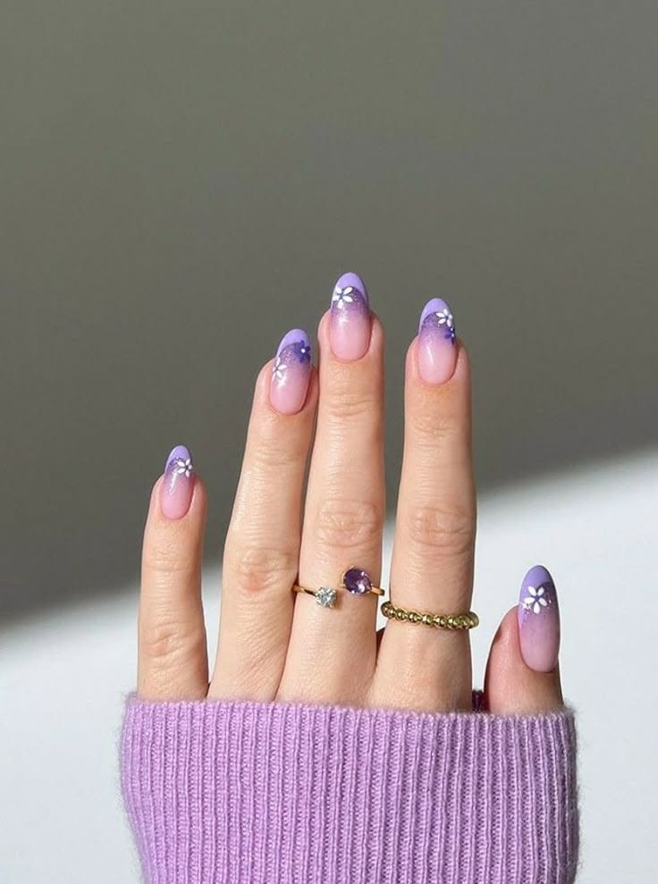 Lilac ombré tips blend into a natural base with tiny white daisy details for a soft floral touch. The vibe is delicate, feminine, and perfect for springtime.