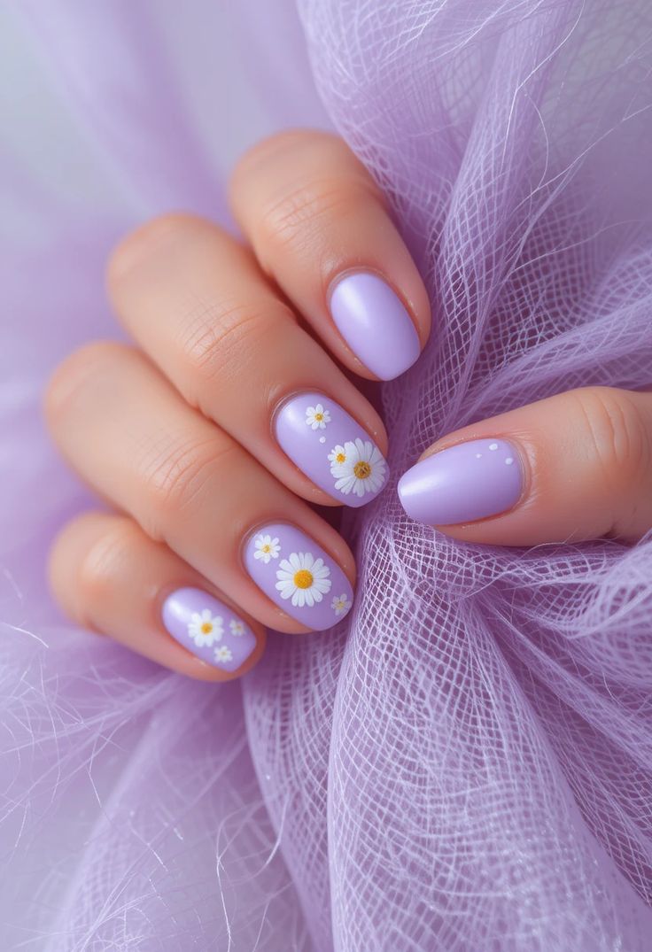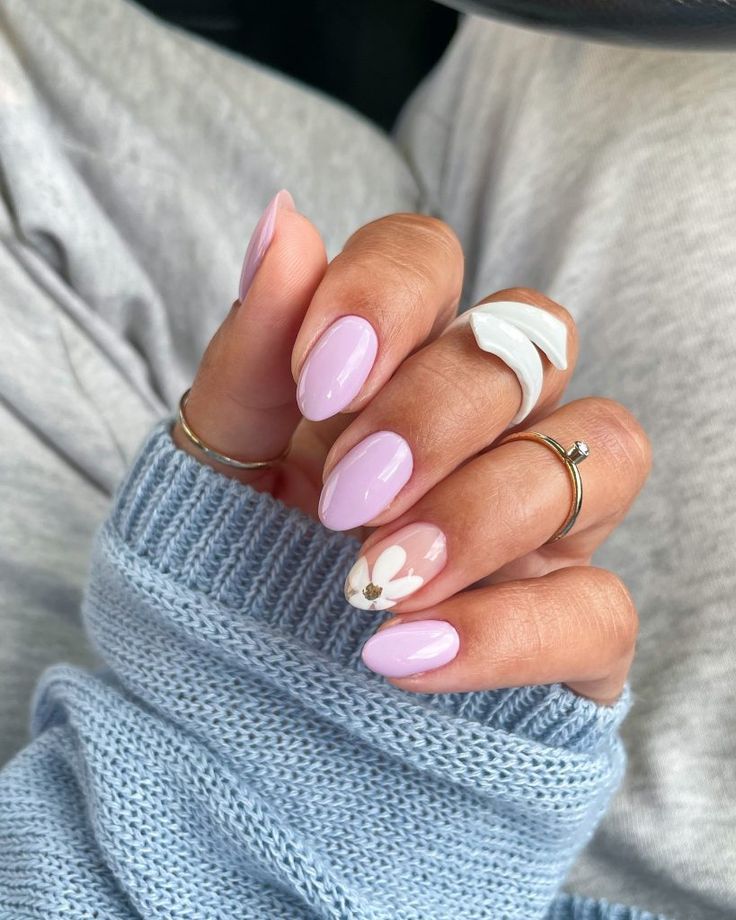 Solid lilac nails are paired with a single white daisy accent on a nude base for a simple floral statement. The style feels clean, gentle, and effortlessly pretty.