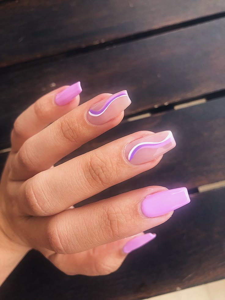 Sheer pink and solid lilac nails mix with a simple white swirl accent for a modern touch. The style is clean, artistic, and subtly eye-catching.