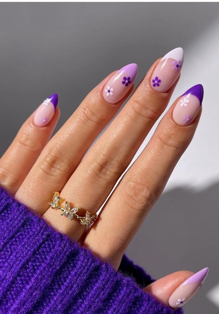 Sheer nude bases meet lilac and deep purple tips decorated with tiny floral details. It gives a fresh spring vibe with a touch of elegance.