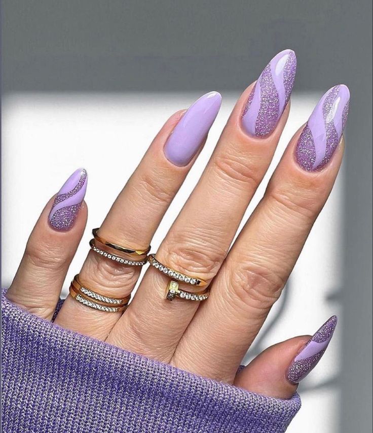 Lilac polish is paired with flowing glitter swirls for a soft, dreamy finish. The look is glamorous but still light and airy.