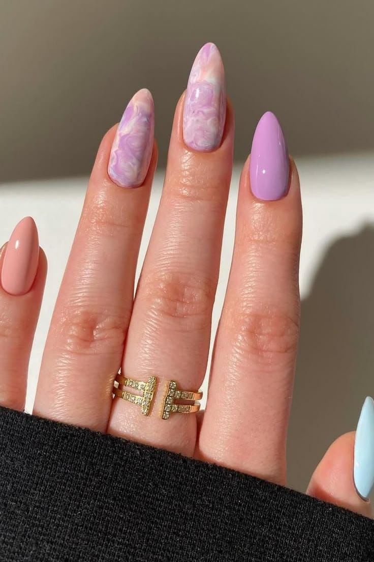 A mix of solid lilac nails and soft lilac-and-white marble accents creates a modern, airy look. The vibe is artistic, light, and perfect for a subtle statement manicure.
