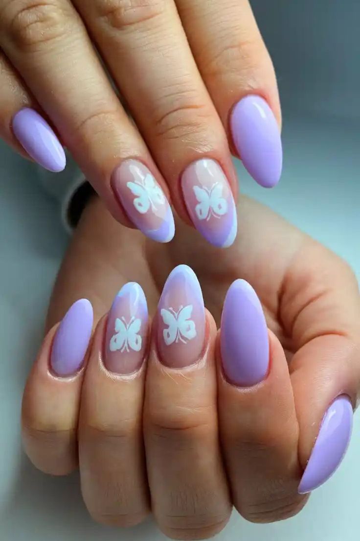 These nails blend nude-to-lilac ombré with crisp white butterfly art for a dreamy, airy effect. The style is graceful, minimal, and softly whimsical.