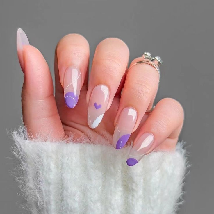 A sheer nude base meets lilac French tips and tiny heart details for a romantic, delicate finish. The design feels clean, cute, and subtly charming.