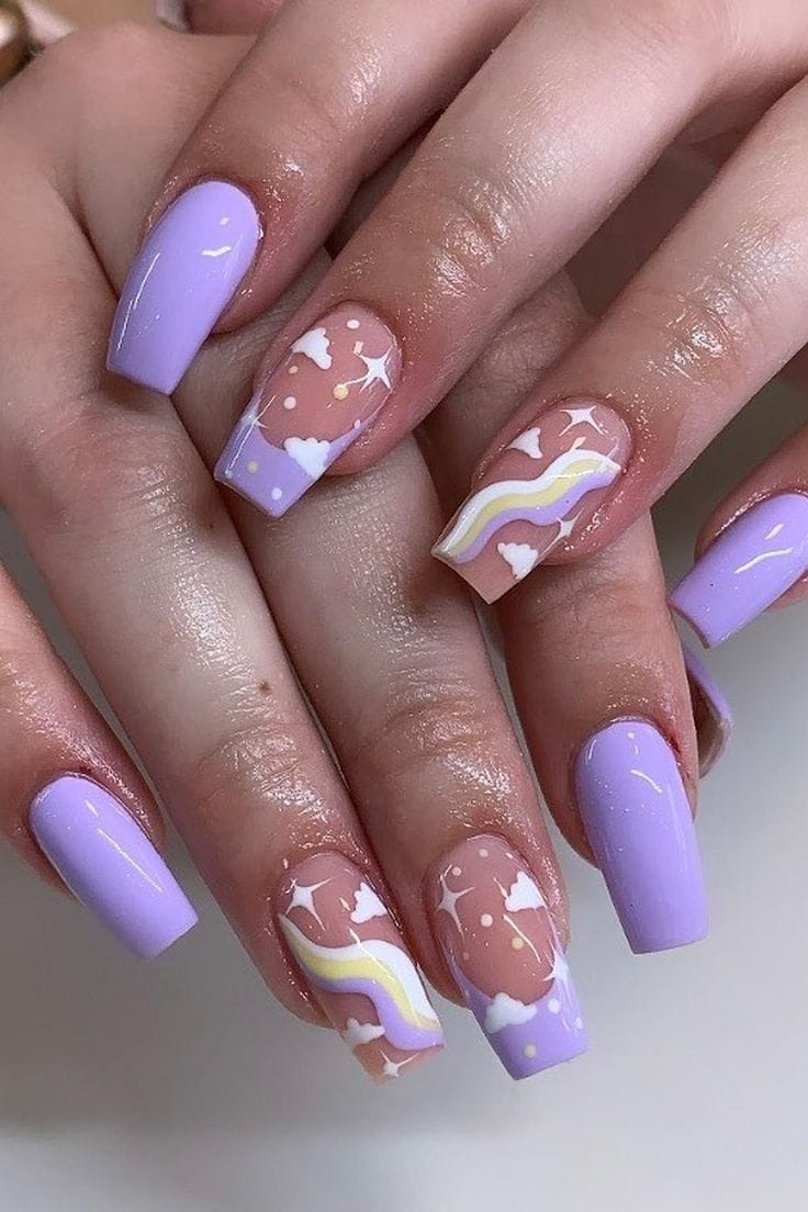 Lilac nails combine with nude accents featuring tiny clouds, stars, and flowing pastel wave lines. The vibe is cheerful, dreamy, and inspired by a soft spring sky.