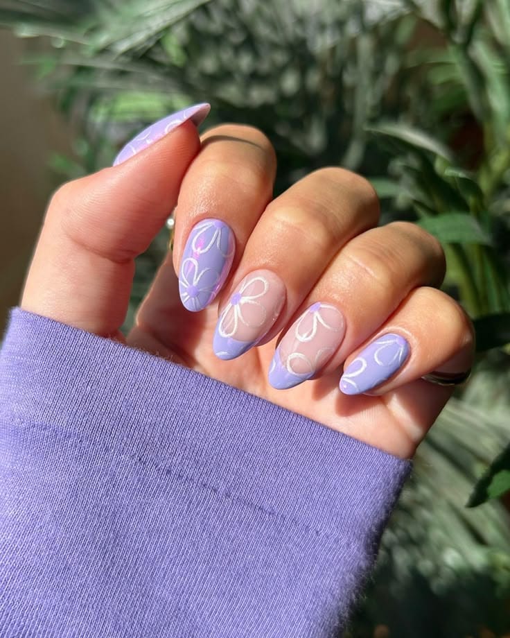 Soft lilac nails mix glossy solid color with delicate petal-like patterns and white accents for a fresh floral vibe. The overall look feels light, artistic, and perfect for spring.