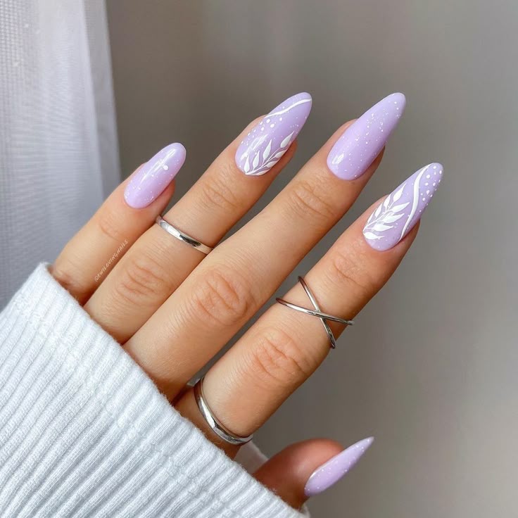 Glossy lilac nails feature fine white leafy patterns and tiny dotted accents. The design is elegant and botanical with a soft, dreamy finish.