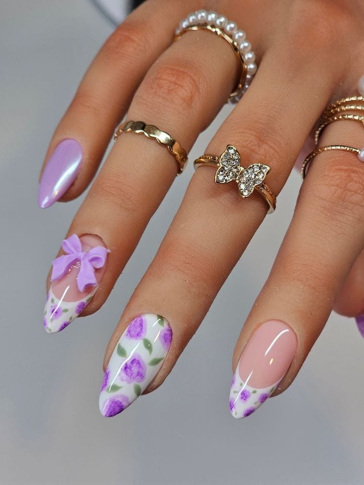 A combination of lilac, nude, and white creates hand-painted floral clusters and even a tiny 3D bow accent. The overall vibe is playful, romantic, and spring-ready.