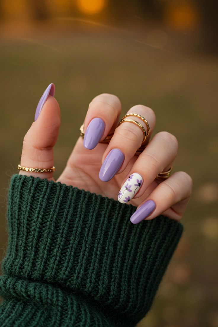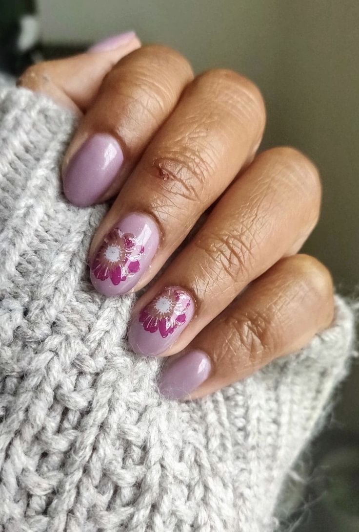Muted lilac nails are matched with a single accent nail showcasing a minimal floral illustration. The overall look feels elegant, soft, and slightly cozy.