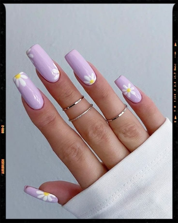Light lilac nails decorated with tiny white daisies create a cheerful and playful spring vibe. The design feels youthful, bright, and charming.