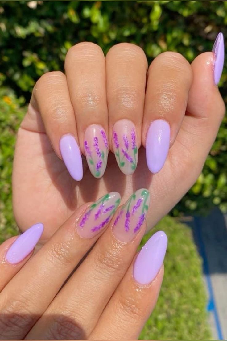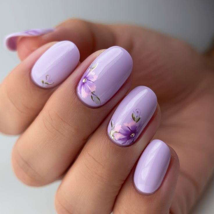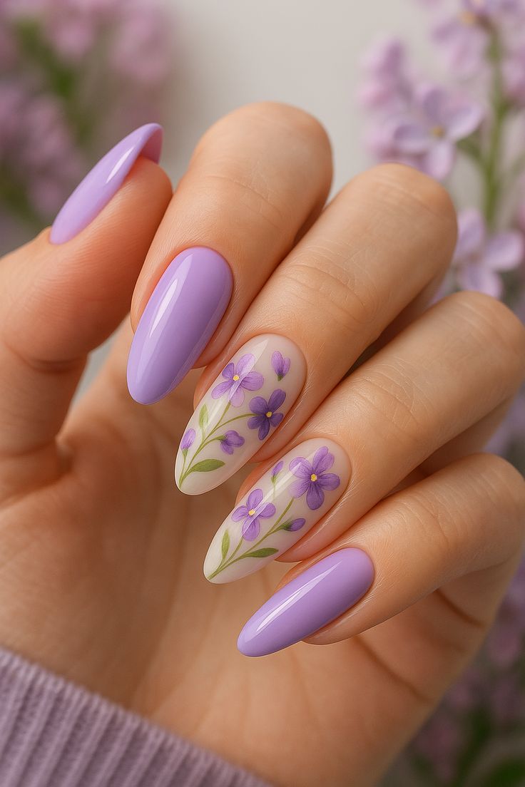 Soft lilac nails are paired with sheer accent nails featuring delicate purple floral sprigs. The look feels fresh, airy, and perfect for early spring.