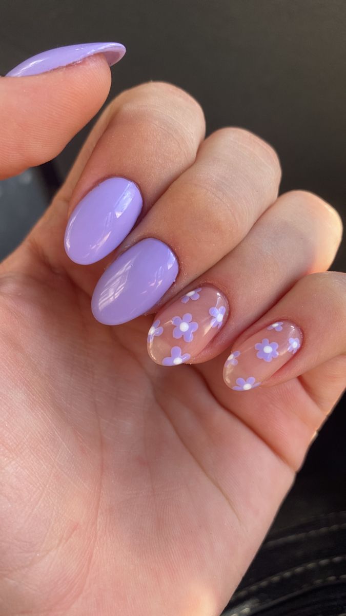 Bright lilac nails combine with clear accent nails scattered with tiny white-and-lilac daisies. The style feels cheerful, youthful, and sunny.