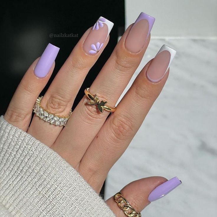 Solid lilac nails paired with sheer nude base fading into lilac French tips decorated with delicate white petal outlines. The look feels airy, minimal, and perfect for a fresh spring vibe.