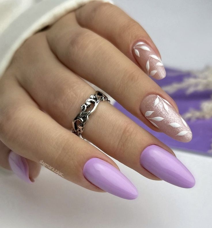 Muted lilac nails with subtle white leaf detailing bring a soft and graceful aesthetic. The style is understated, chic, and nature-inspired.