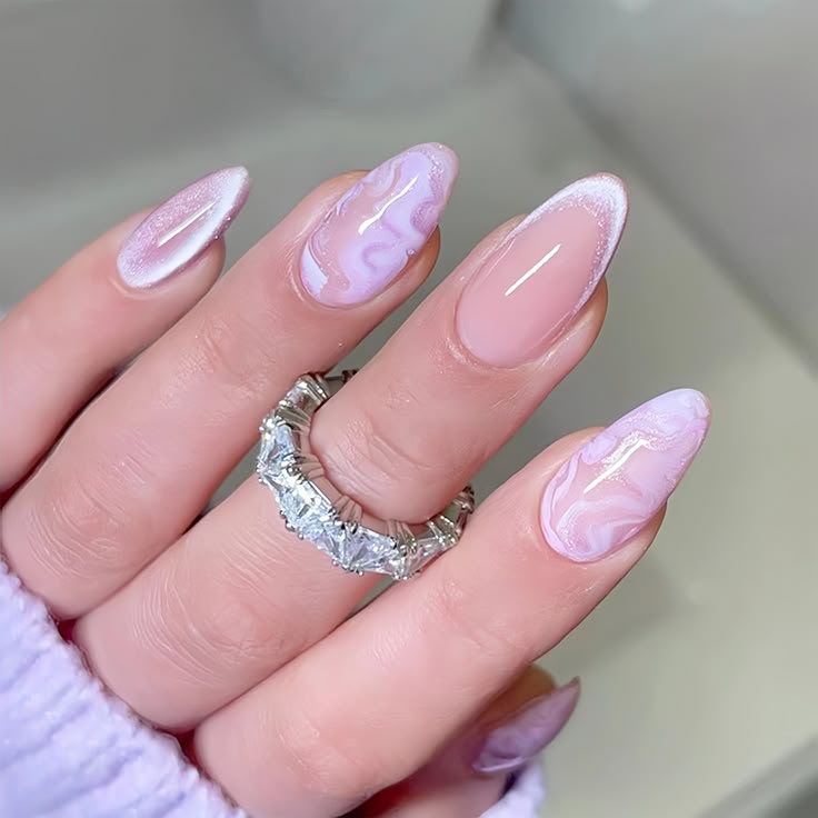 Shimmery lilac swirls over a sheer pink base create a dreamy, glossy finish. The look feels delicate, luminous, and romantic for spring.