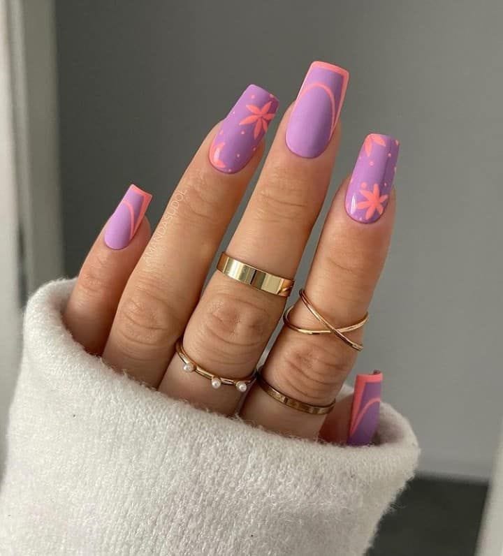 This design features lilac and pink square nails with delicate floral accents and curved tip outlines. The overall vibe is playful, spring-fresh, and softly feminine.