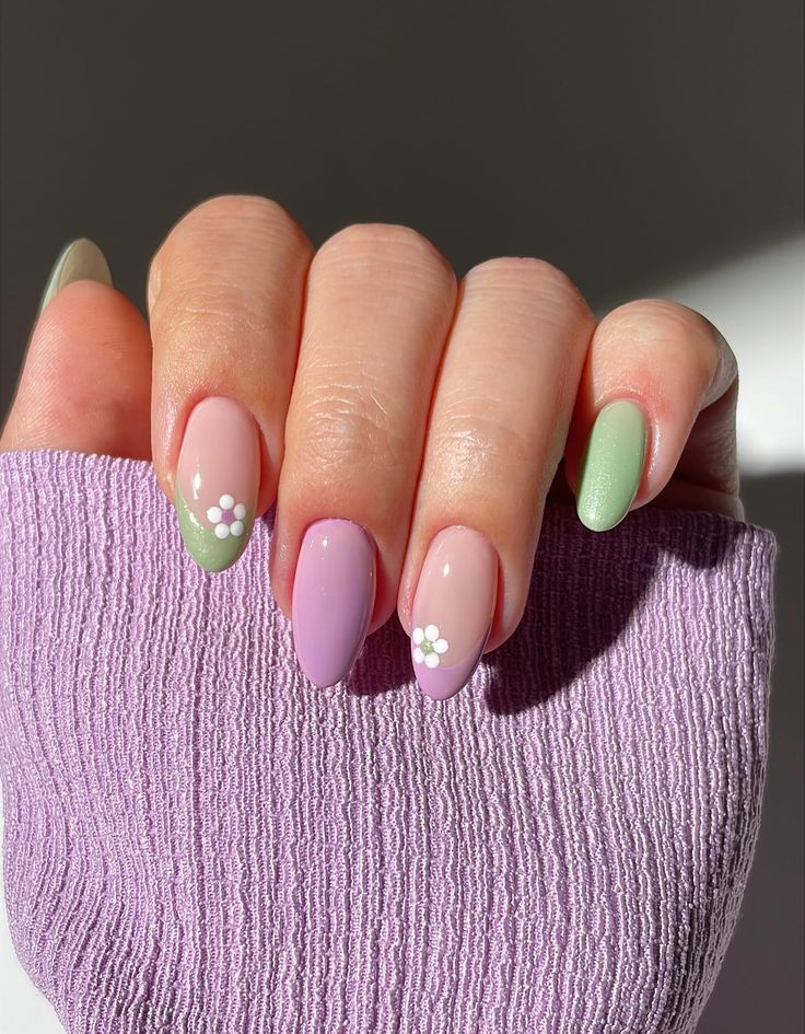 Short almond nails combine soft lilac, blush pink, and fresh green with tiny white daisy details. The style is simple, cheerful, and perfect for a natural spring look.