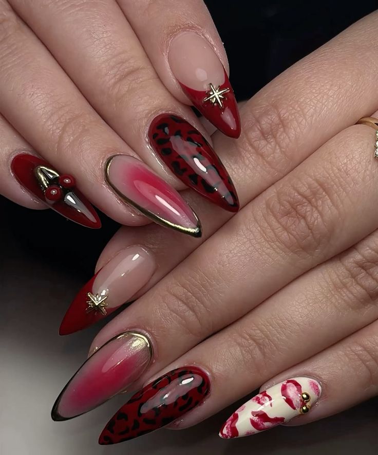 A beautiful gradient effect with shades of red transitioning into a nude base. The mix of gold detailing, leopard print, and smooth gradient gives these nails a glam, trendy edge perfect for any chic occasion.