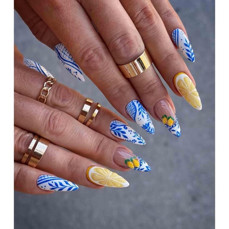 A refreshing and elegant design with intricate blue floral patterns and delicate yellow lemon accents. The almond shape beautifully complements the artistic style, evoking a fresh, springtime feel.