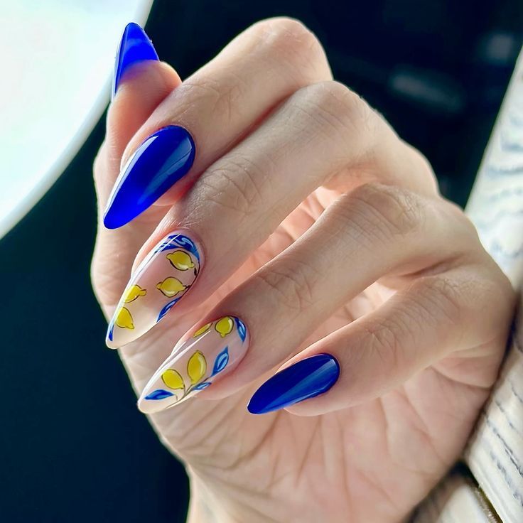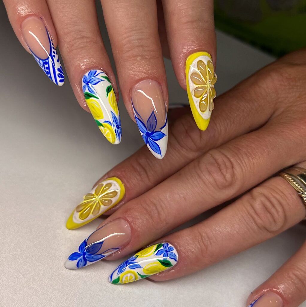 A perfect blend of blue and lemon yellow, this nail design uses bold colors and striking citrus designs, offering a modern and playful vibe. The almond shape gives it a refined edge.