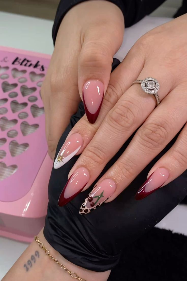A stunning red gradient with a burgundy and golden tone on the almond-shaped nails, this design captures the warmth of autumn. A small white star and delicate details add a holiday-inspired touch.