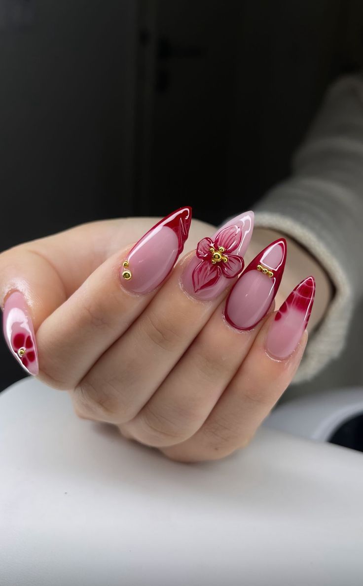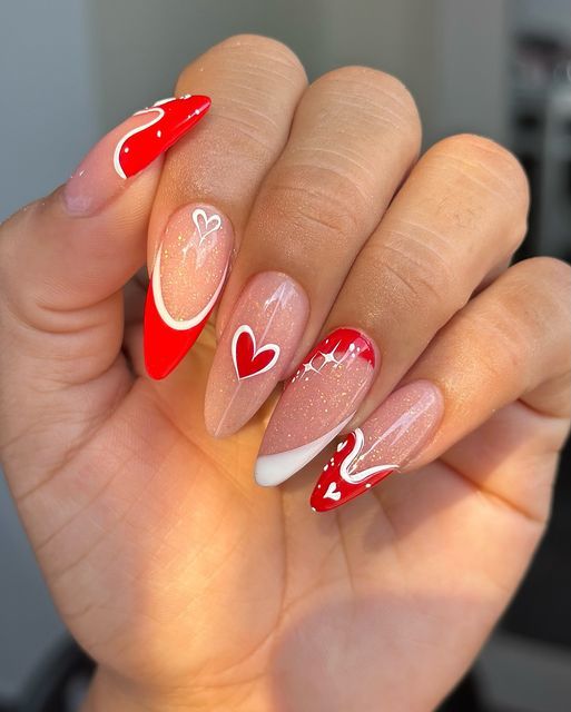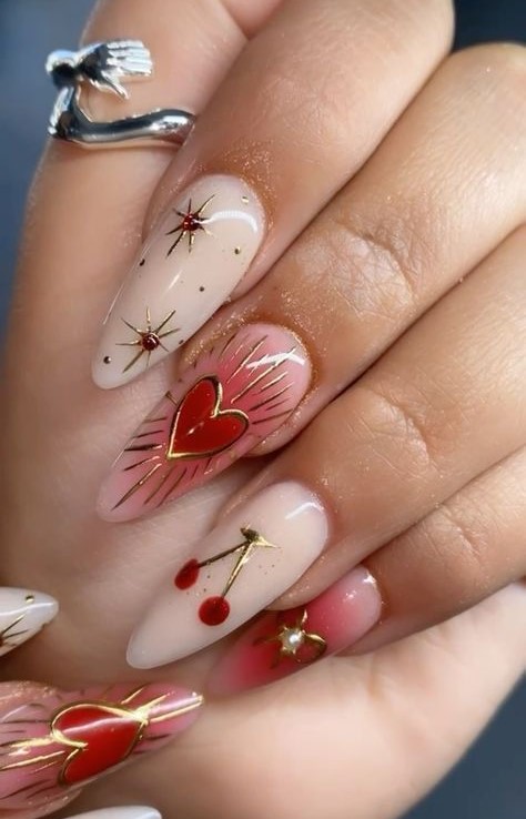 These nails play with a gradient of soft pink to red with heart accents, making them an ideal choice for a romantic date or any occasion where you want to showcase love and elegance.