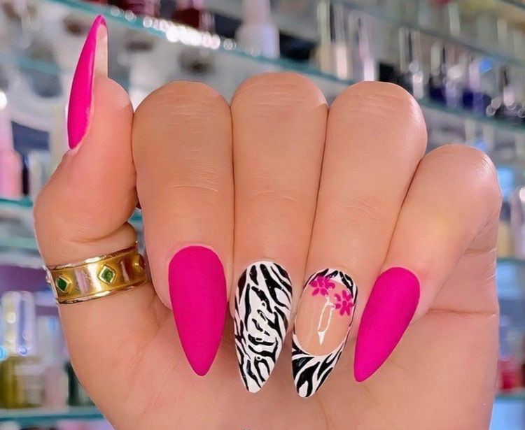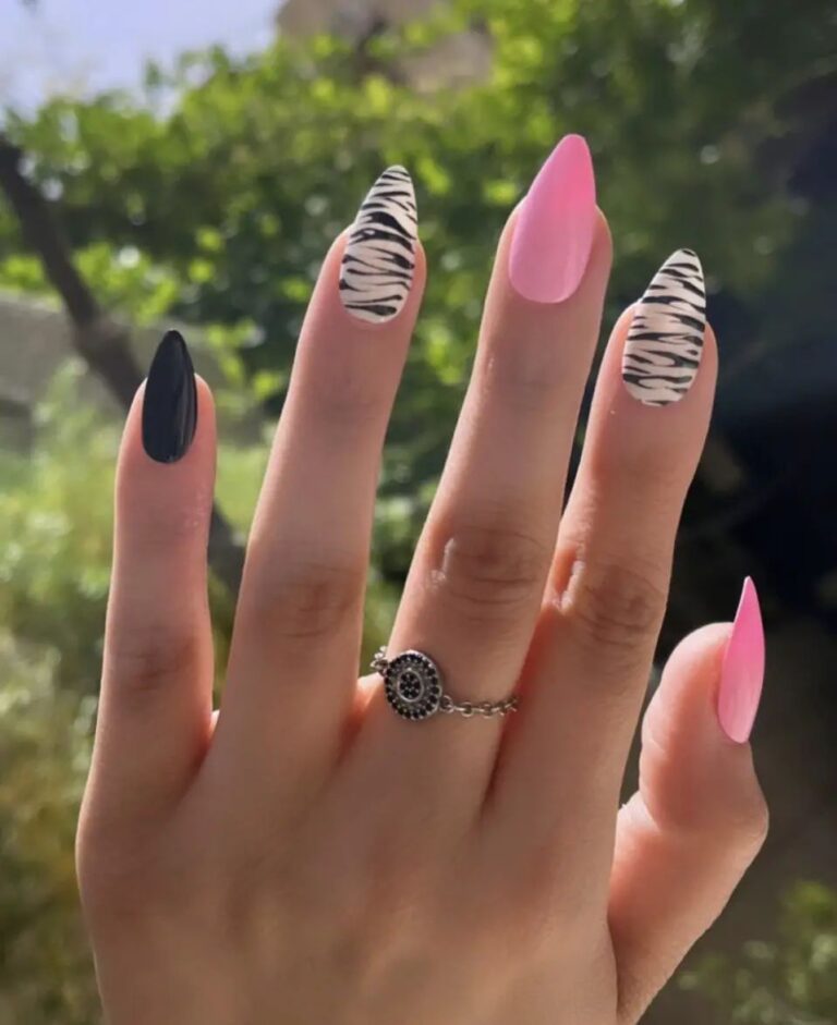 Bold, edgy, and fun, this design incorporates vibrant pinks paired with eye-catching zebra stripes. Perfect for someone looking for a wild yet stylish look, the almond shape adds an unexpected touch of class.