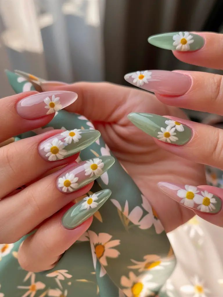 A perfect design for spring, these nails feature soft pastel tones of green and pink with floral detailing. The almond shape emphasizes the flow of the design, creating an airy, fresh look.