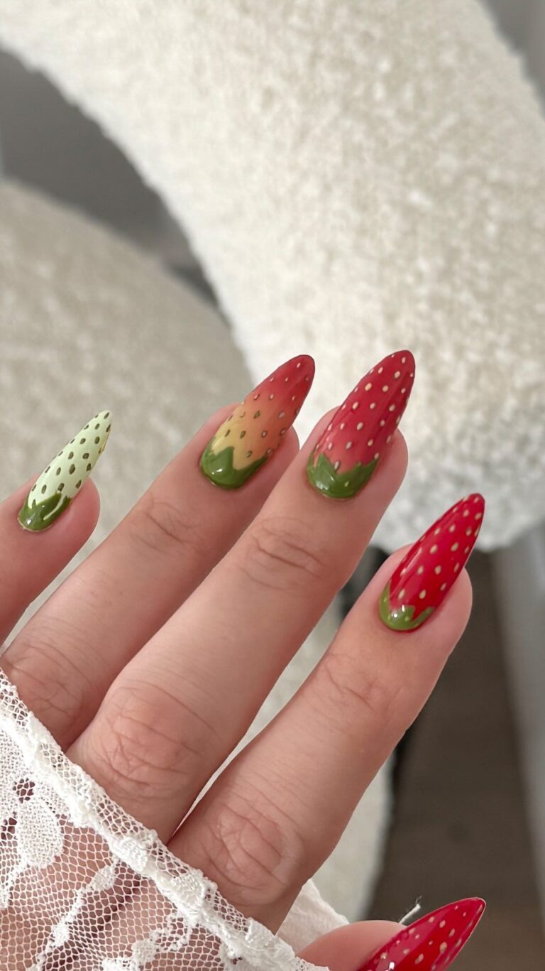 This playful and sweet design resembles a strawberry patch with red, green, and soft orange tones. The almond shape elevates the natural fruit theme into a stylish and trendy nail art look.