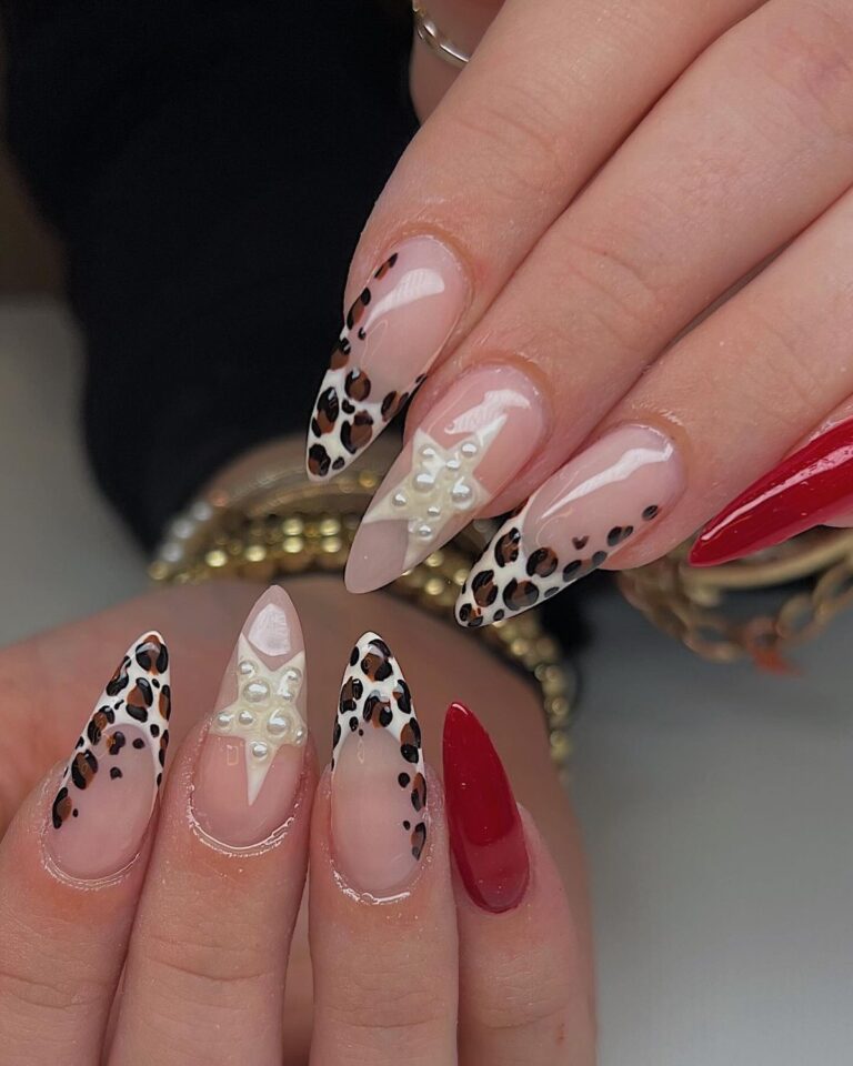 With a nude base and a hint of leopard print near the tips, these long almond nails stand out with added pearl embellishments. The combination of the wild leopard spots and the delicate pearls makes for a sophisticated yet edgy look.