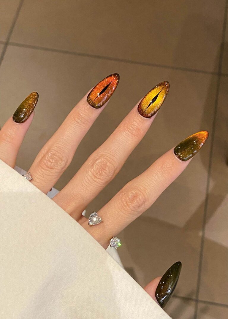 A mesmerizing mix of orange and dark green shades, this gradient design is complemented with an eye-like shape, giving it a mysterious and chic fall-inspired look. The almond shape is perfect for accentuating this mysterious vibe.