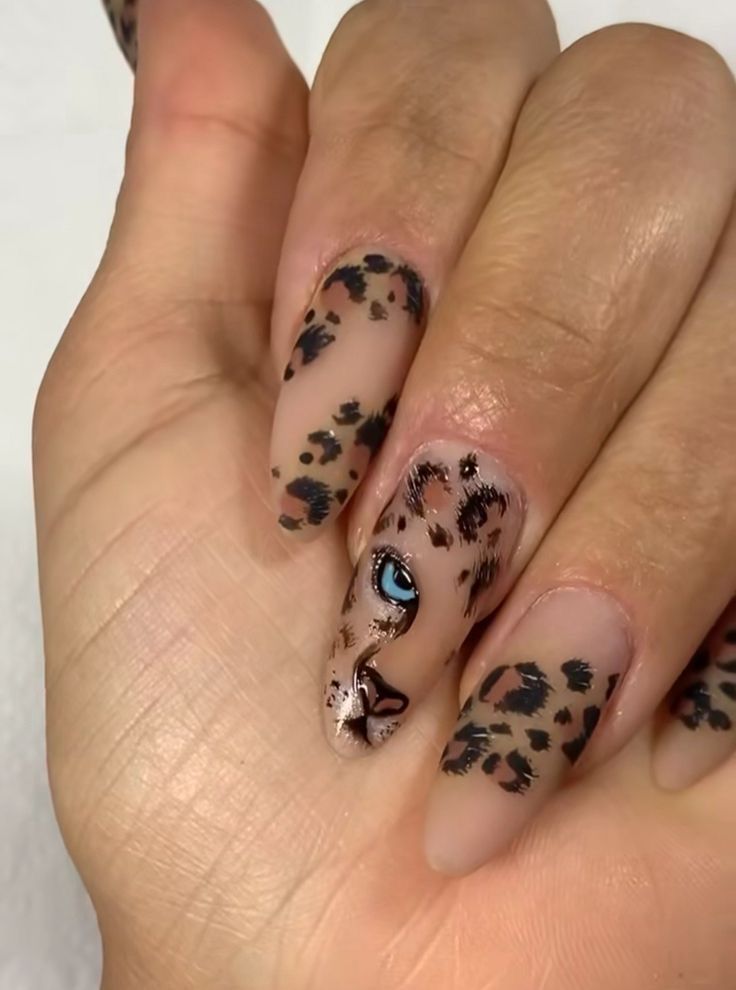 This design features a captivating leopard print with a stunning feline eye for an edgy and wild vibe. The almond-shaped nails showcase a perfect blend of animalistic patterns, making it a fierce choice for fashion-forward individuals.