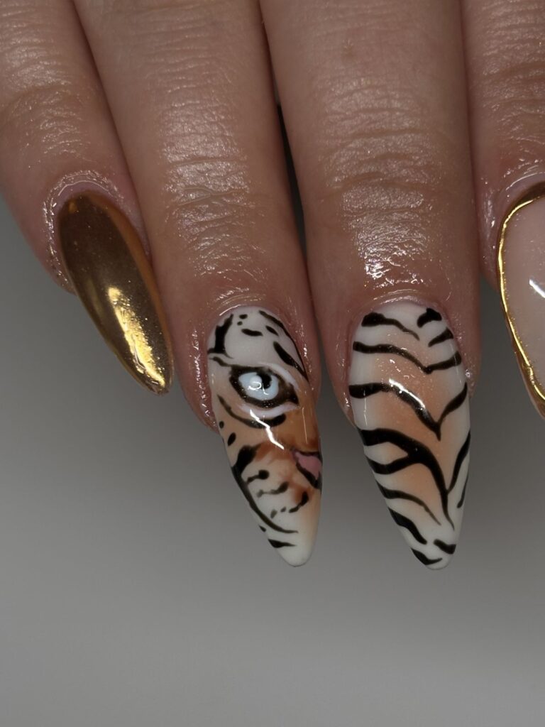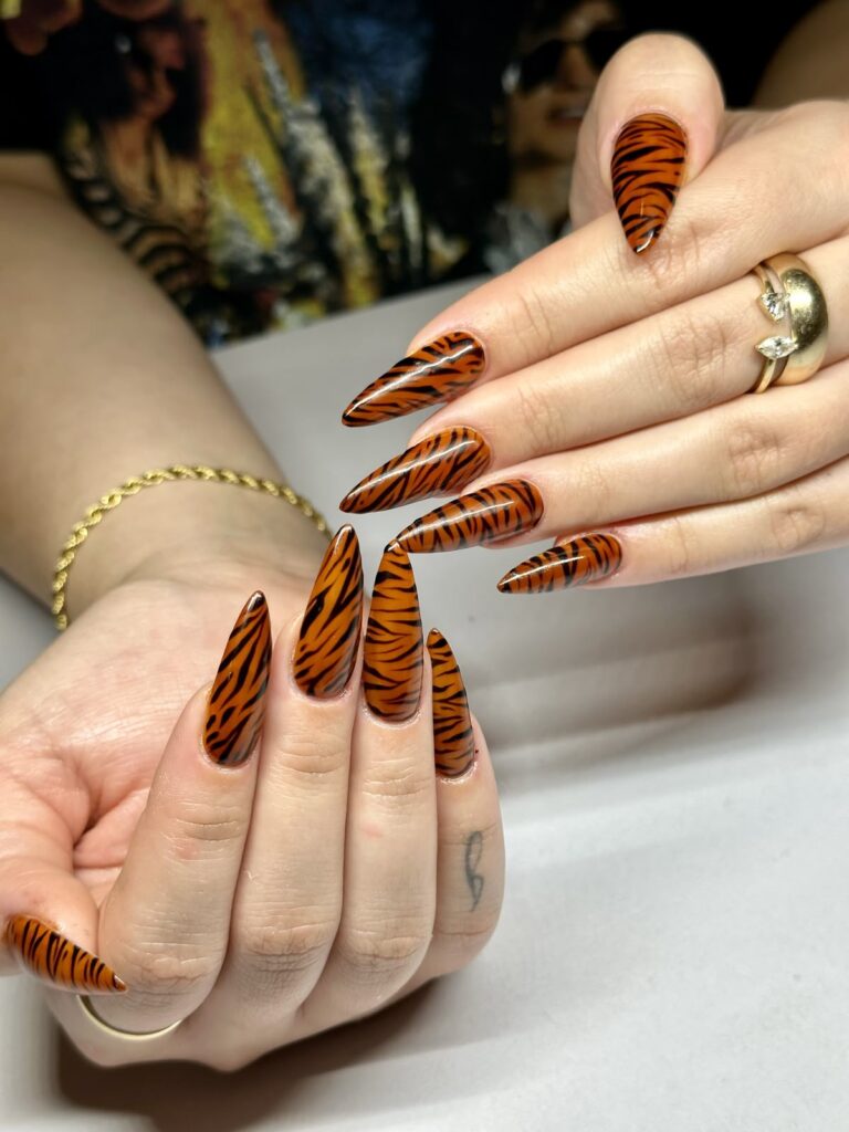 A powerful tiger-inspired design dominates these nails with black and orange stripes, giving a bold and untamed look. The almond shape enhances the sharpness of the stripes, creating a statement piece for lovers of animal prints.