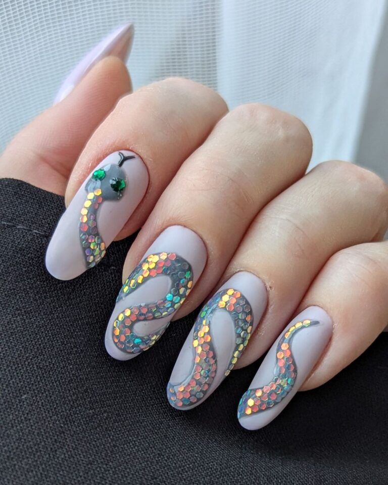 A smooth gradient of blue and green with a metallic serpent winding its way across the nails creates a sleek, edgy design. The delicate and shimmering accents elevate this snake-inspired style, perfect for someone wanting an elegant yet bold look.