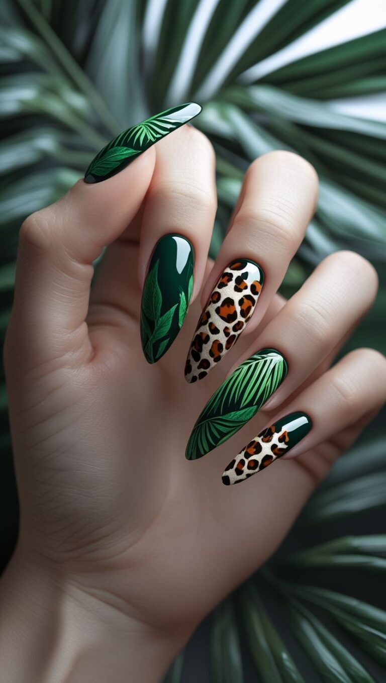 A perfect blend of tropical leaves and leopard print, this design captures the essence of the jungle. The bold green leaf art paired with subtle animal spots makes it an ideal look for someone who loves nature-inspired aesthetics with a hint of wildness.