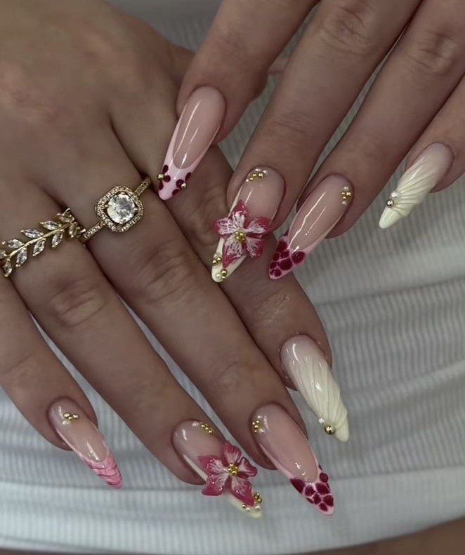 Soft pinks and creamy whites combined with delicate floral designs make this almond nail set a perfect match for those who love elegance and femininity. The golden accents add a luxurious touch to this floral masterpiece.