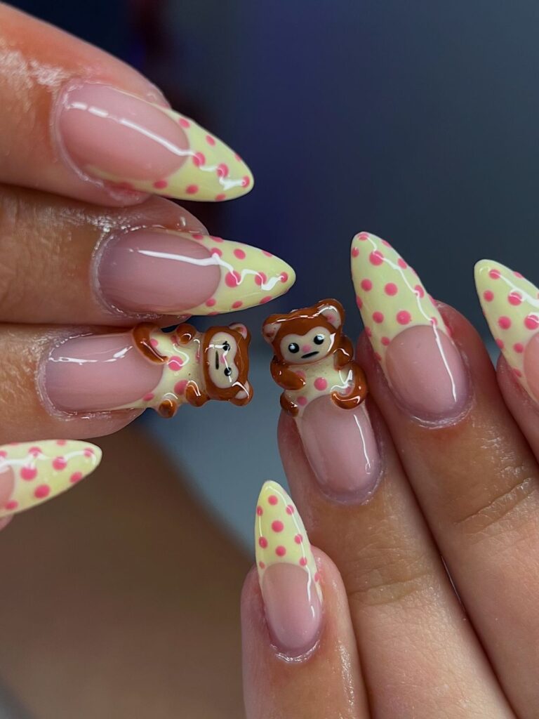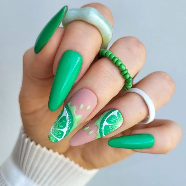 A combination of bold green with a playful lime design, these nails bring a touch of summer fun with citrus-inspired patterns. The contrast between the vibrant green and pastel base is both refreshing and fashionable.