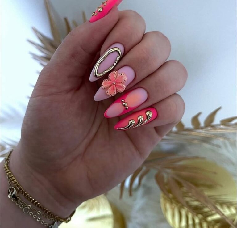 A combination of neon pinks and delicate golden details makes this design pop with vibrancy and charm. The bold flower and geometric accents make it a perfect choice for someone who enjoys playful yet stylish designs.