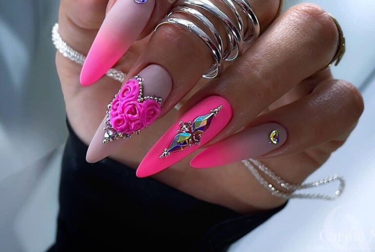Vibrant pink and soft nude gradients are complemented by floral rose detailing and jewels, creating a romantic and sophisticated nail art design. The almond shape enhances the design’s elegance, ideal for a special occasion.