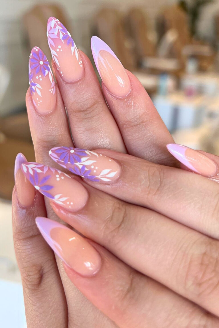 A light purple design with intricate floral patterns covering the top portion of the nails. This delicate look is perfect for those who want a soft, feminine touch with a burst of color to bring attention to the almond shape.