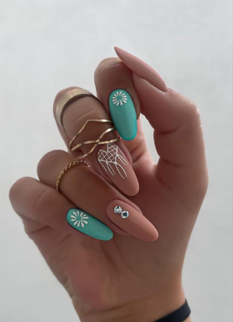 A soft nude base with turquoise and white accents, featuring a delicate dreamcatcher design. Perfect for those who love a whimsical, nature-inspired aesthetic, these nails capture the essence of freedom and serenity.